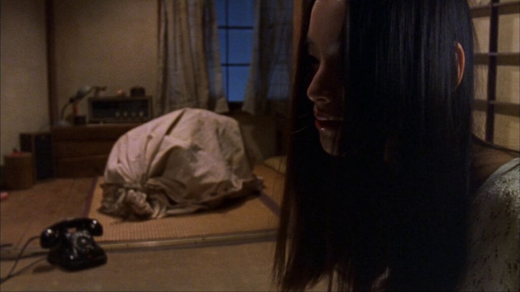 Image Credit: IMDB In Takashi Miike's Audition, you see the man, Aoyama, mentally debating whether or not he should call Asami. You see Asami sitting strangely with her hair in her face and a large bag. It's odd, but it isn't until Aoyama calls her and Asami lets it ring, and the bag starts to roll around. It's a surprise that is quite disturbing.