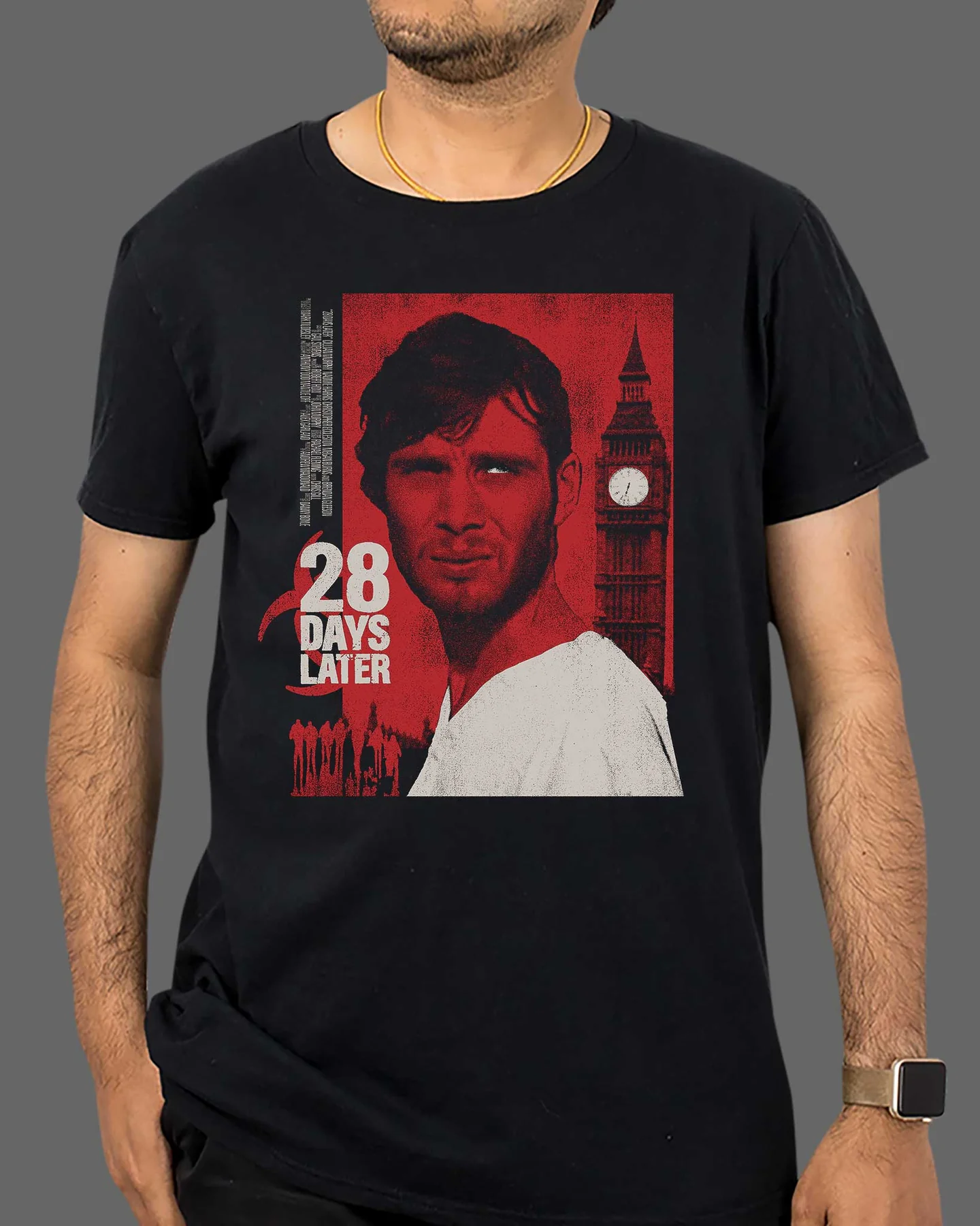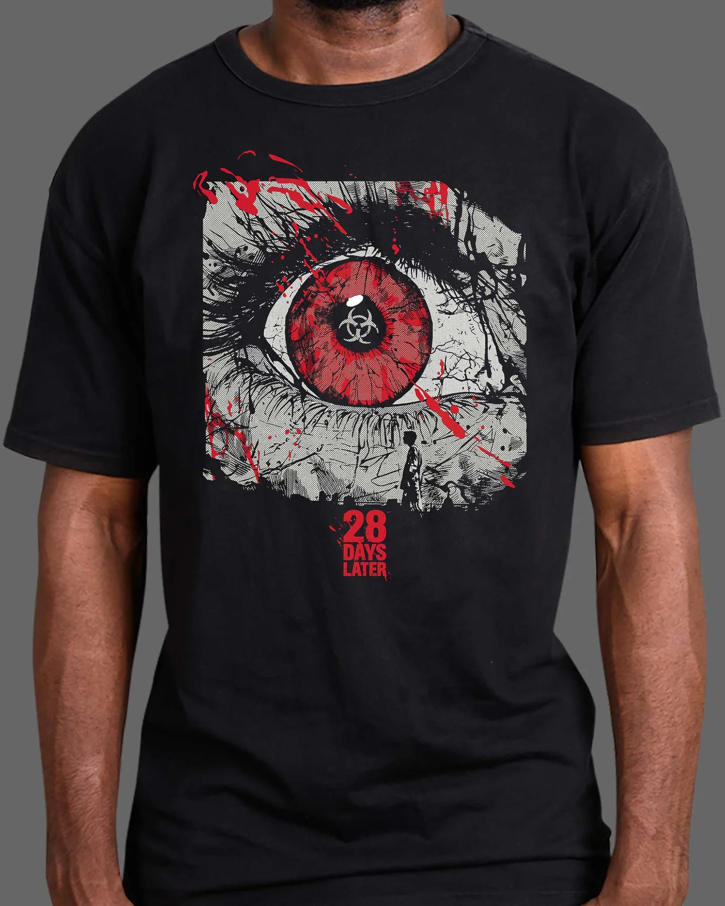 Currently, they’re offering three designs, all on black shirts with muted red and white designs by Kyle Crawford. The first, “Rage,” features the eye of someone infected with the rage virus, spiraling out of control, while “The Days Are Numbered” features a motif of skulls, biohazard symbols, and the number 28. The third, “Alone,” puts original star Cillian Murphy front and center alongside the film’s title, in a replica of one of the most famous stills from the film. All three shirts retail for $33 USD, and are also available in Comfort Colors options.