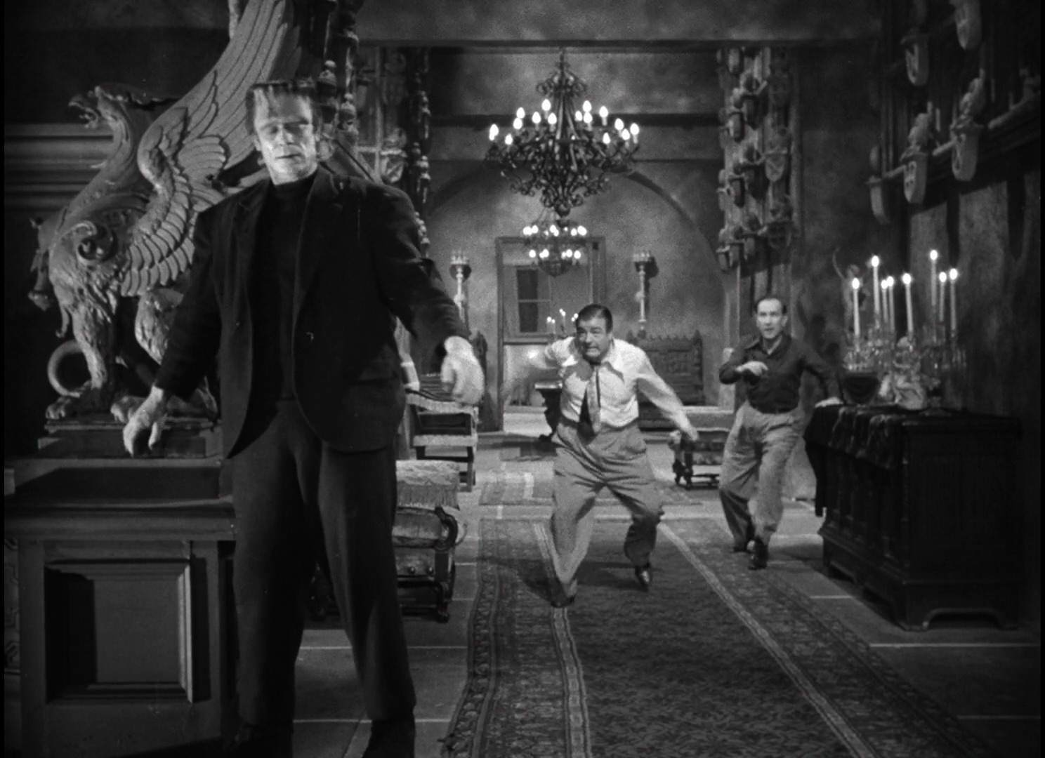 And what eerie atmosphere it is! While the ghosts are just masquerading mobsters (spoiler), there is a pervasive dread that manages to penetrate the comedy every now and then. Hold That Ghost may not be as horrific as what followed, but connoisseurs of the weird will find much to admire here. Even the best gags are on the strange side: bodies vanish and reappear at inopportune times, a neat in-camera effect transforms a bedroom into a casino, and a candle seems to move by ghostly means… but Lou is the only one who ever sees it. The “moving candle” routine in particular is a classic, later appearing in Abbott and Costello Meet Frankenstein. While we're on the subject…