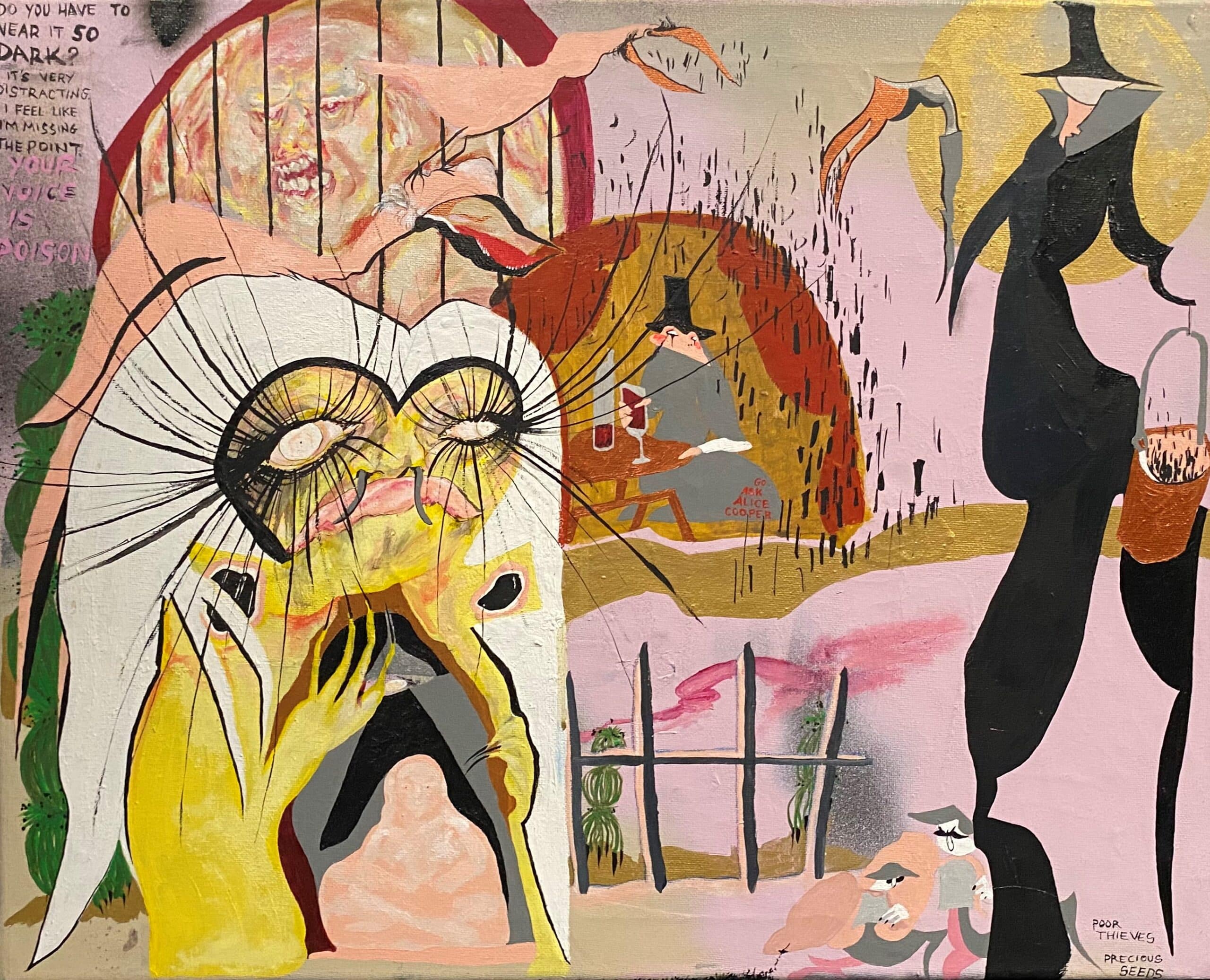 About six years ago, the bizarre creations of Bridget Hryc began appearing like spores in the back alleys and underground music spaces of the city. Surreal and intricate, beautiful and twisted, her teeming images remind you of a chemically-induced bad dream or a maniac’s mythology. Indeed, some of the characters she paints actually began life in campfire stories she spun for friends. She explains: “When you get smoke in your eyes from the fire, you call to the dead rabbit and he makes the smoke go the other way.”