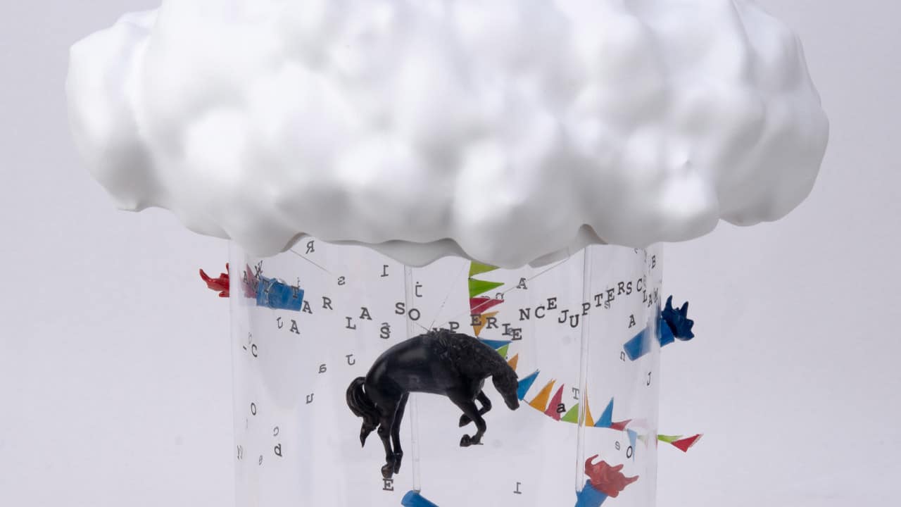 NOPE – “Spectacle” – Much like the film, this piece was about creating a spectacle. I wanted to create a piece that captured moments of the cloud, horse, and flags that also captured the moment of our obsession and reflection on the spectacle. Therefore, I decided to use a reflective base so the spectator would see themselves entranced in the spectacle of the piece itself. This base also replicates both the VFX ball and the TMZ reporter's helmet… (Acrylic, 3D printed resin, hand painted)