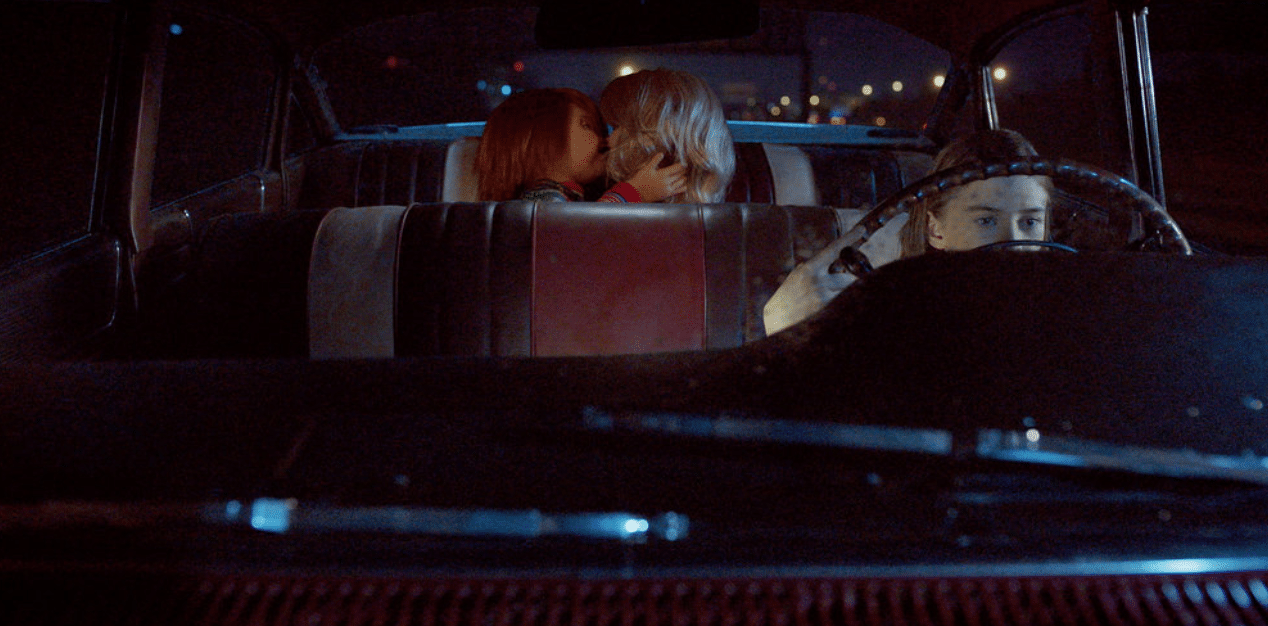 Caroline drives Tiffany’s car away. Via the rearview mirror, she sees the Chucky and Tiffany dolls making out with each other in the back seat. Caroline declares, “I am too young for this shit.”