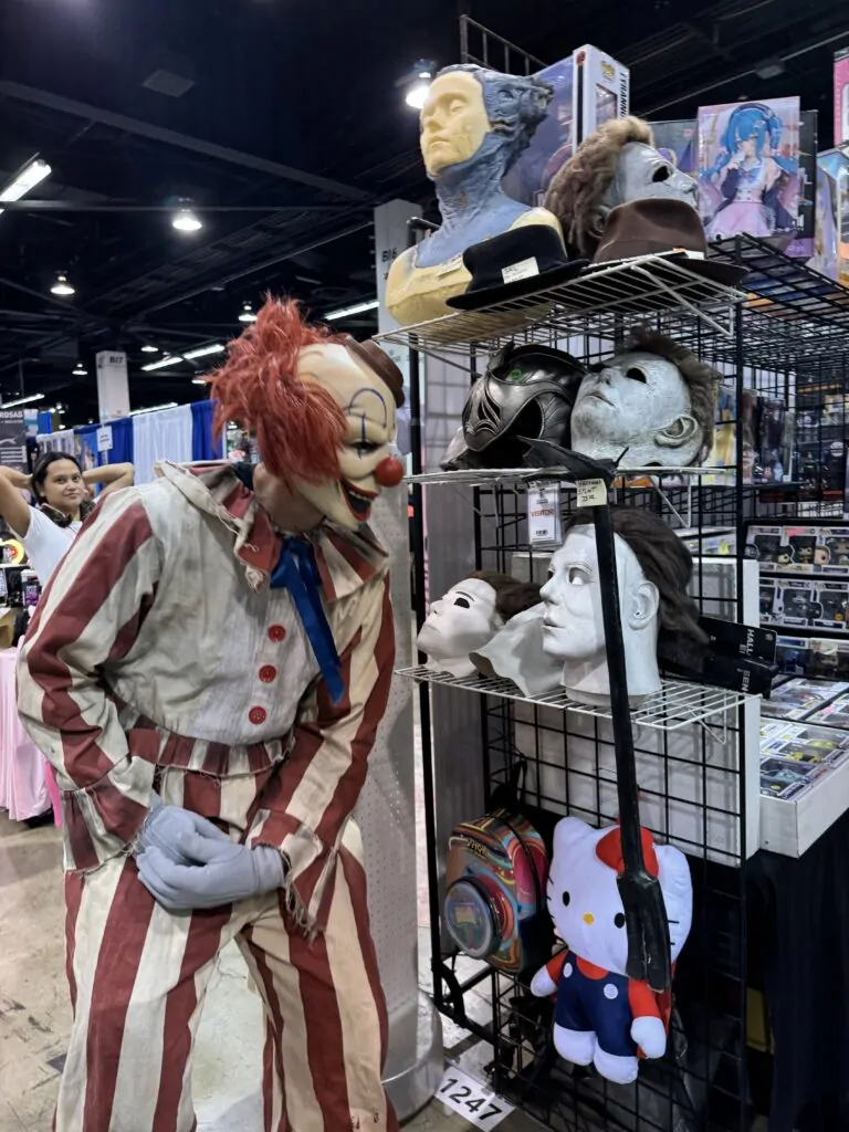 In the newly released images, Frendo stalks con attendees inside the convention center and outdoors, taking photos and menacing anyone who tried to get his way, similar to his invasion of SXSW during the film’s premiere. He even met up with fellow murderous clown Art from the Terrifier franchise — or at least, a cosplayer dressed as him. This all occurred while stars Katie Douglas, Aaron Abrams and Will Sasso, as well as director and co-writer Eli Craig led a panel about the film, which hits theaters next month.