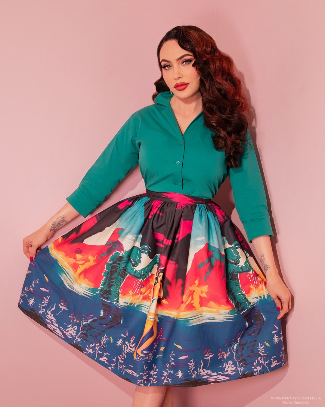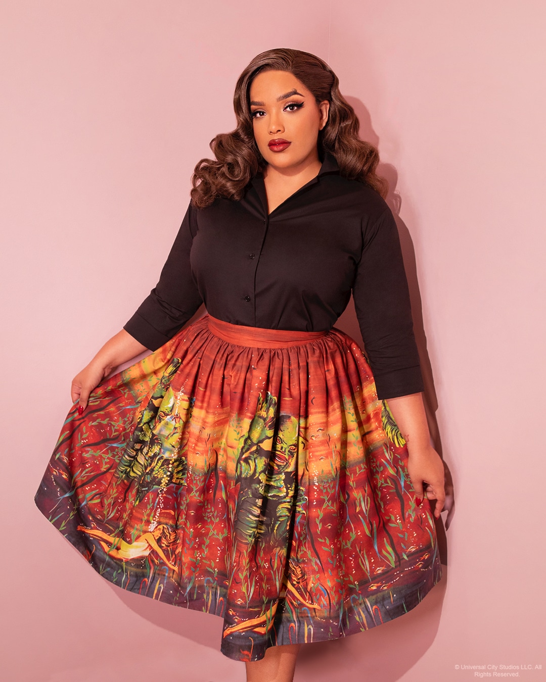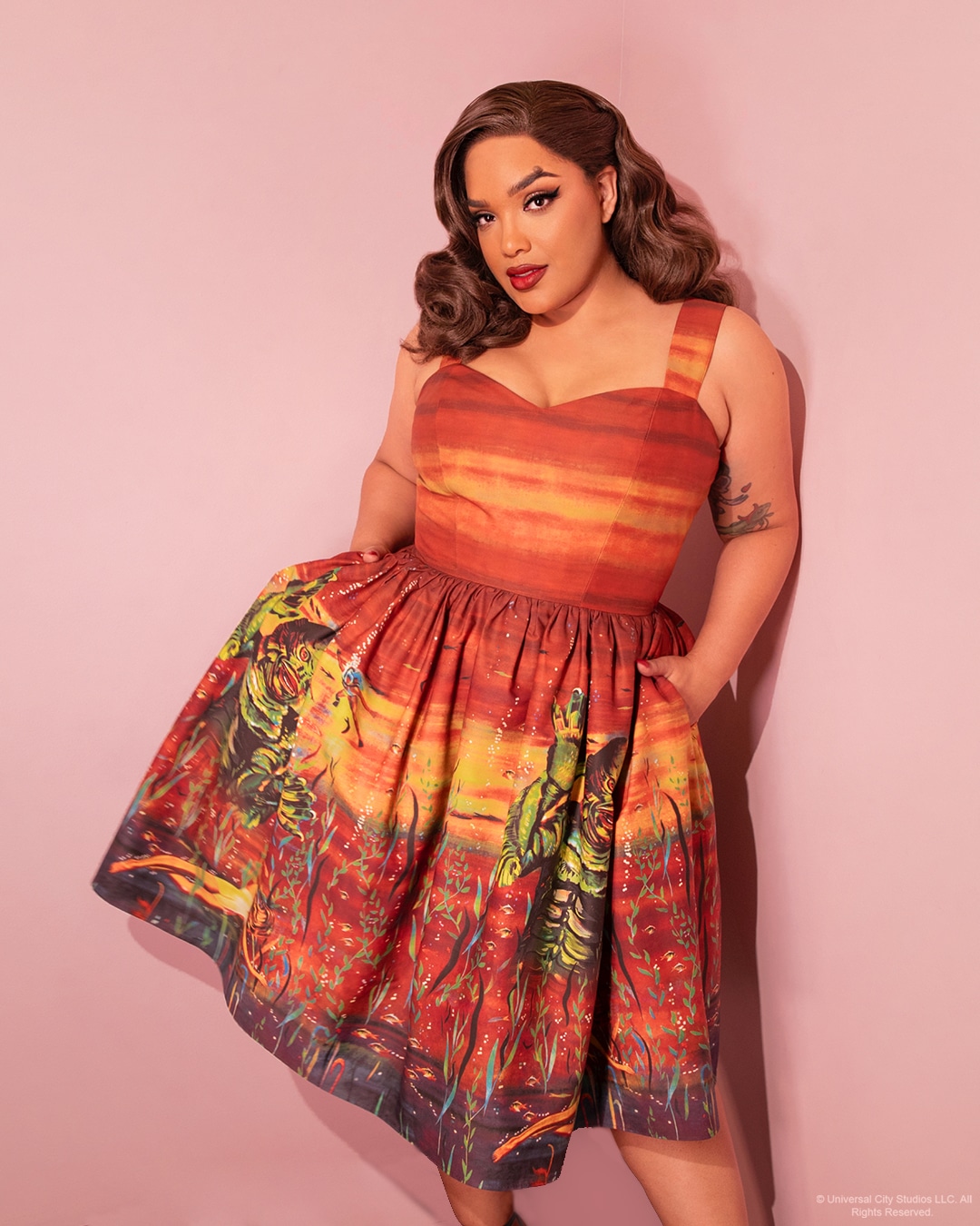 “Each collection, like the films on which they are based, has its own story to tell, and its own style, and as one of the first female owned fashion brands to have ever licensed a horror property,” stated Pitt, “we’re excited to celebrate Creature From the Black Lagoon through fashion, having been a lifelong fan of the Universal Monsters.”