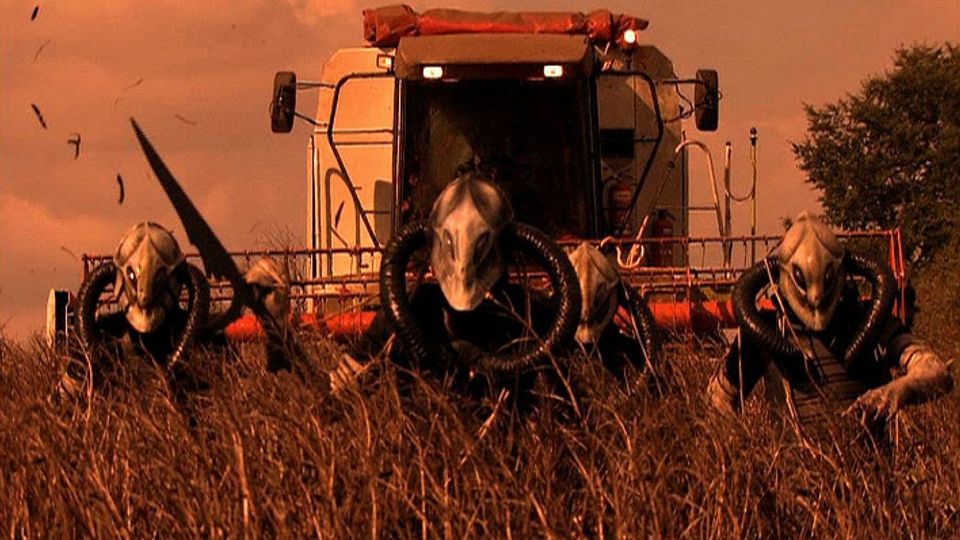 The motley group of people she travels with/finds there allow West to poke fun at UFO conspiracy theorists and indulge in regional humor (the Welsh locals’ response to the English in their midst is especially amusing). But splatstick soon takes over, as first cattle and then humans are grotesquely violated, and the latter start violating the aliens back. All this is staged by West with flair and energetic style that, while familiar from other movies of a similar bent, keep things moving fast enough to gloss over the fact that the plot is essentially a series of sketches. He knows and tweaks the conventions of the subgenre—it becomes a running joke that whenever someone assaults an alien, the result is a splash of blood that hits them directly in the face—and he keeps the confrontations varied. West also throws in a few de rigueur homages to his forebears, including an explicit reference to Day of the Dead and a moment where someone contemplates using a lawnmower against their attackers, à la Jackson’s Dead Alive.