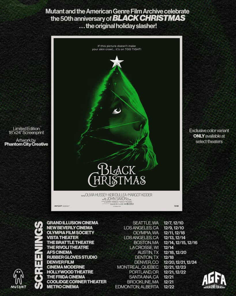 The poster, with art by Phantom City Creative, comes in three colorways perfect for the season – red, green and white. The green version (seen below) will be available exclusively at select Black Christmas 4K theatrical screenings taking place across the country from December 7 onwards, courtesy of the American Genre Film Archive.