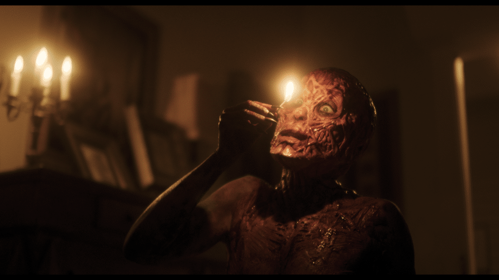 “The makeup took me three hours to apply, assisted by Heather Rose, and consisted of ten prosthetics, claws, and teeth dentures. Radha unreservedly transformed and acted the hell out of this demon. Her performance was so powerful and precise, we were fortunate to have her.”
