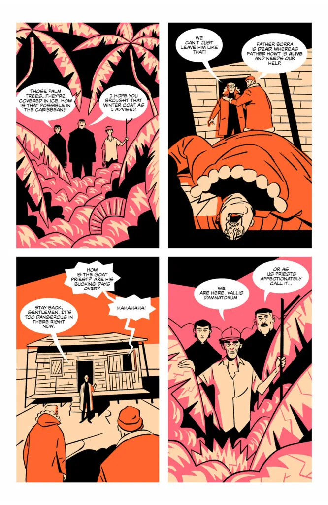 Exorcism Island teams up comic book writer Jordan Thomas with artist Chris Matthews, the pair behind the acclaimed series Mugshots, who’ve known each other since elementary school. The five-issue series will be released monthly via Comixology beginning on October 21, and its synopsis is as follows: