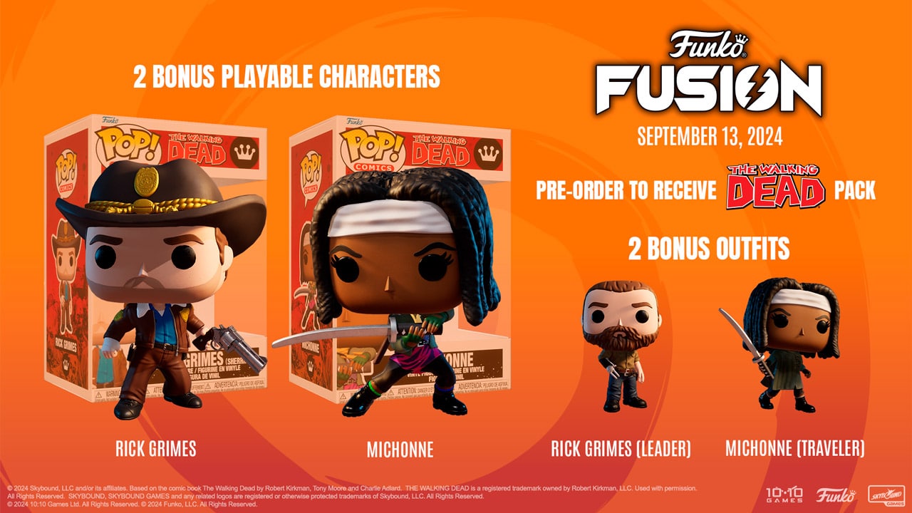 Funko Fusion will be available on September 13, 2024 on Steam, Epic Games Store, Xbox Series X|S, PlayStation 4, PlayStation 5, and Nintendo Switch. Fans can pre-order physical editions of the game starting today at select global retailers, and if you do, you will receive The Walking Dead pack at launch for no additional cost! The pack which includes two additional playable characters from Skybound’s award-winning The Walking Dead comic books – Rick Grimes and Michonne Hawthorne. The pack includes Variant Outfits for both characters – Rick Grimes as Alexandria's Leader and Michonne in her Traveler outfit.