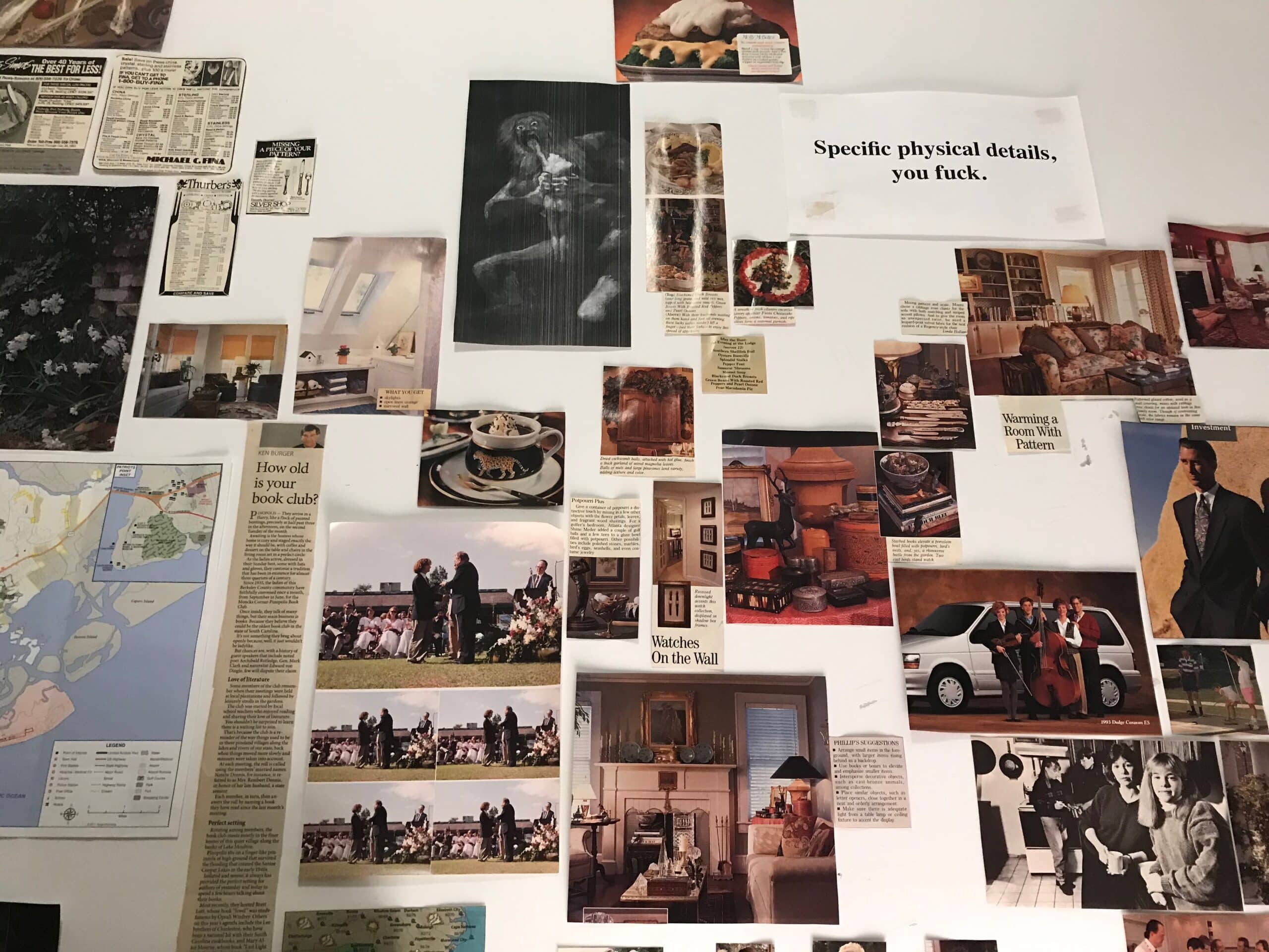 Pictures of ‘90s clothes and ‘90s food helped me keep my head in the decade and reminded me of things like Jolt Cola, the fad for low-sodium and low-cal cooking, the rise and fall and rise of margarine and butter substitutes (I Can’t Believe It’s Not Butter!, Country Crock, Molly McButter), and how terrible special occasion food could be. I also clipped pictures from ads to stand in for my main characters. You can see my model for the face of Maryellen Papadopoulos down there on the lower left with her dog, Skipper.