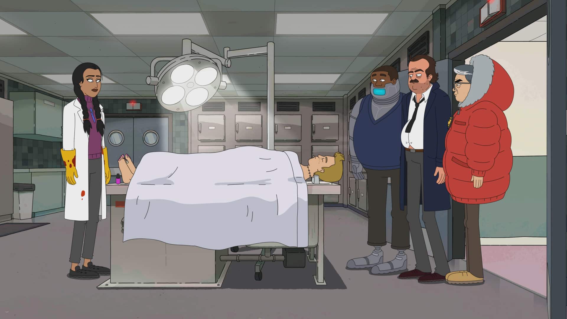 Chainsaw- 1 Random dude's head – 0. Grimsburg, you had us at decapitation. The stellar voice cast, headed up by Jon Hamm (Marvin Flute), also stars Erinn Hayes (Harmony Flute), Rachel Dratch (Stan Flute), Alan Tudyk (Dr. Rufis Pentos/Mr. Flesh), Kevin Michael Richardson (Det. Greg Summers), and Greg Chun (Lt. John Kang).