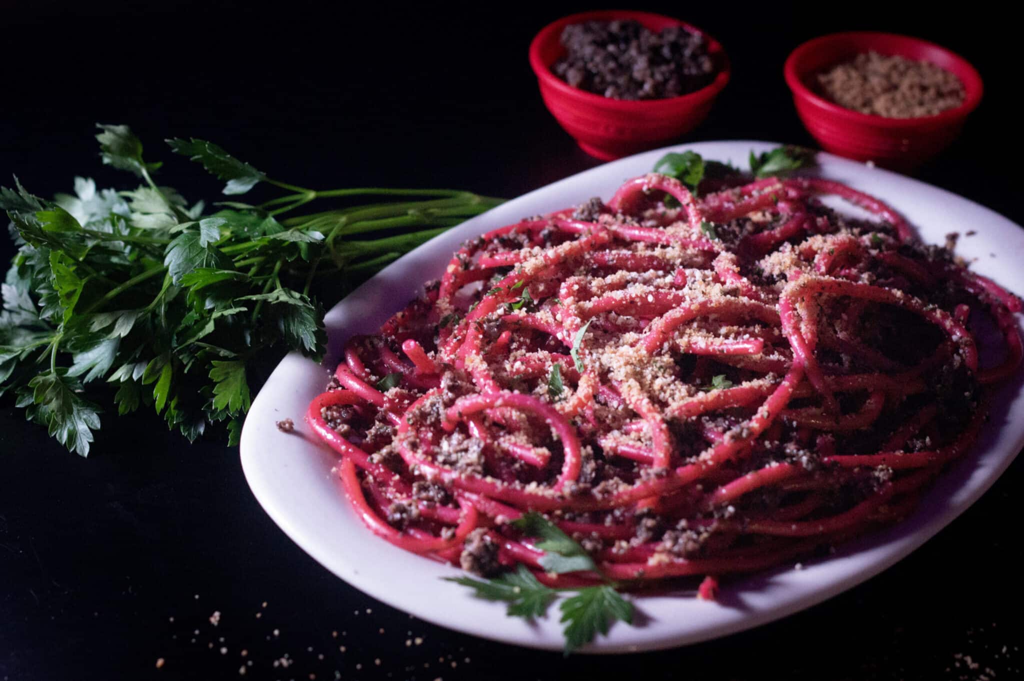 A scene from the film shows Amelia harvesting earthworms from her garden to feed the Babadook, which inspired me to create a unique themed dish — Babadook Dirt and Worms Bucatini. I've transformed classic bucatini noodles (that's a fancy way of saying hollow spaghetti) into a creepy-crawly treat, tossing them in a homemade olive tapenade and garnishing them with parsley, breadcrumbs, and Parmesan to mimic the look of freshly dug earth — deliciously spooky and way tastier than actual dirt and worms! Serve with freshly baked bread and a green salad for a complete meal.