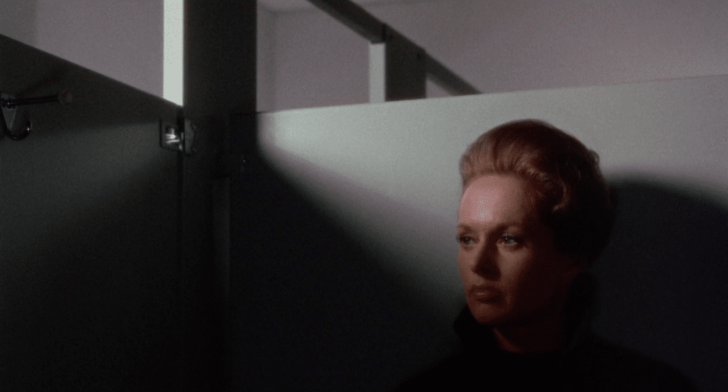 We begin in the bathroom — always an important locale for Hitchcock —as we see Marnie nestled amongst the shadows of the toilet stalls. When she makes her way into the ghostly quiet of a vacated workplace, she is discreet, methodical, and watchful.