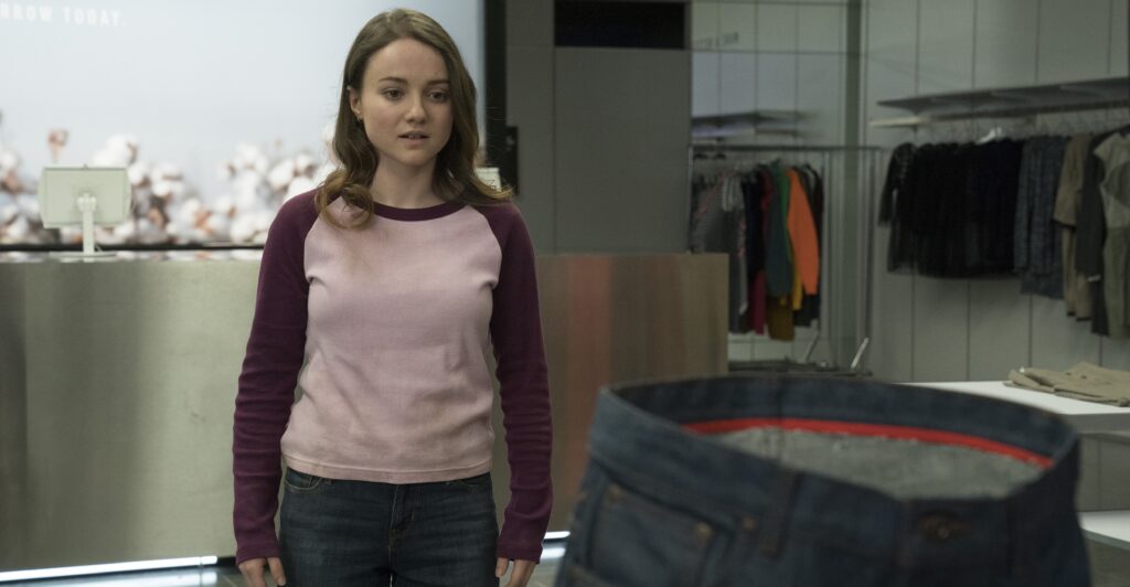 Image Credit: IMDB Slaxx takes place in a supposedly ethical clothing store the night before the launch of a brand-new product that promises to revolutionize jeans. Not only are all of the employees locked in the store, they are locked in with a sentient pair of killer pants. Is this a mall set story? I think so because most clothing stores are either in a mall, indoor or outdoor these days. Directed and co-written by Elza Kephart, this socially conscious fear film is bloody and brutal, much more than its comedic themes would suggest. It's funny as a deft horror comedy.