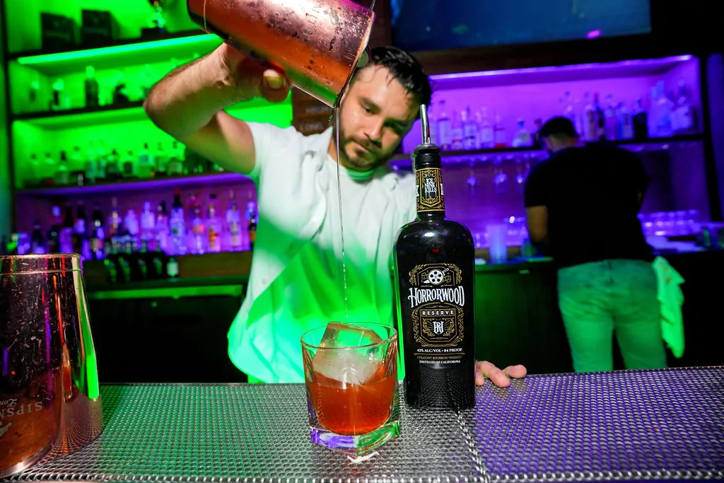 INK and Macabre Spirits hosted the world premiere of the music video alongside a whiskey tasting of Horrorwood Reserve, featuring special recipes like the “Old Slashioned” and a “Piña Killada” (we do love a good pun!). I admit I was a tad apprehensive about a bourbon piña. As someone who enjoys both bourbon and the occasional colada, I have never fused the two together. It was surprisingly delicious. The whiskey itself is smooth enough to sip straight, with light notes of cinnamon. Horrorwood Reserve bottles come with ten collectible drink recipe cards featuring beloved horror icons, plus a brass INK bottle stopper.
