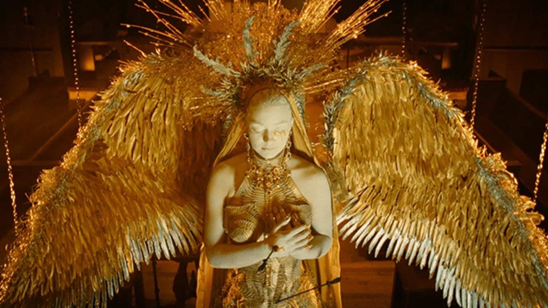 In an interview with director Mauro Borrelli, he explained this scene was originally supposed to take place in an alley, and the body was to be discovered on a telephone pole. Due to the logistics of building a pole in the location and hoisting the fallen angel up said pole, he opted for the train instead. Resulting in a happy accident if you ask us. Without that logistical tweak, we wouldn't get the juxtaposition of the corpse's golden wings, marble-like skin, and burnt orange gown popping against the black steel of the train, or the Rolls-Royce Spirit of Ecstasy hood ornament vibes. Borrelli also has a background in fine arts, which lends itself to this world of morbid beauty.