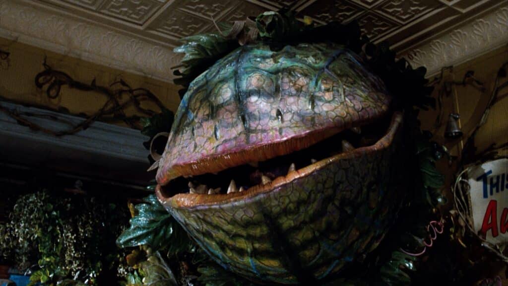 “Little Shop Of Horrors” started as a horror film made by Roger Corman, then became an off-Broadway musical written by composer Alan Menken and writer Howard Ashman, and then became a film again as a horror comedy musical adaptation of the successful stage play. Frank Oz directed it, and the musical version adds a trio of singers that act as a Greek chorus. It stars Rick Moranis, Ellen Greene, Vincent Gardenia, and Steve Martin. Since Audrey II is a carnivorous plant that eats several people throughout the film, I can state that the horror is within the film and not just in the title.