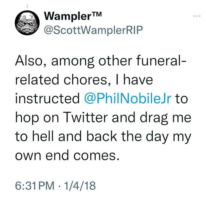 And now, in death, Scott gets the last laugh, as I and a close circle of friends are forced to interact with real world businesses and event professionals to help make sure Scott is sent off in… well, in a very stupid way. In a very Scott way. The conversations we’ve been forced to have with actual grownups about the graphics alone… that sonofabitch. He got our asses. He’s gonna get the epic hang he always felt entitled to and, as in life, he won’t be around to help clean up afterward. Classic Wampler.