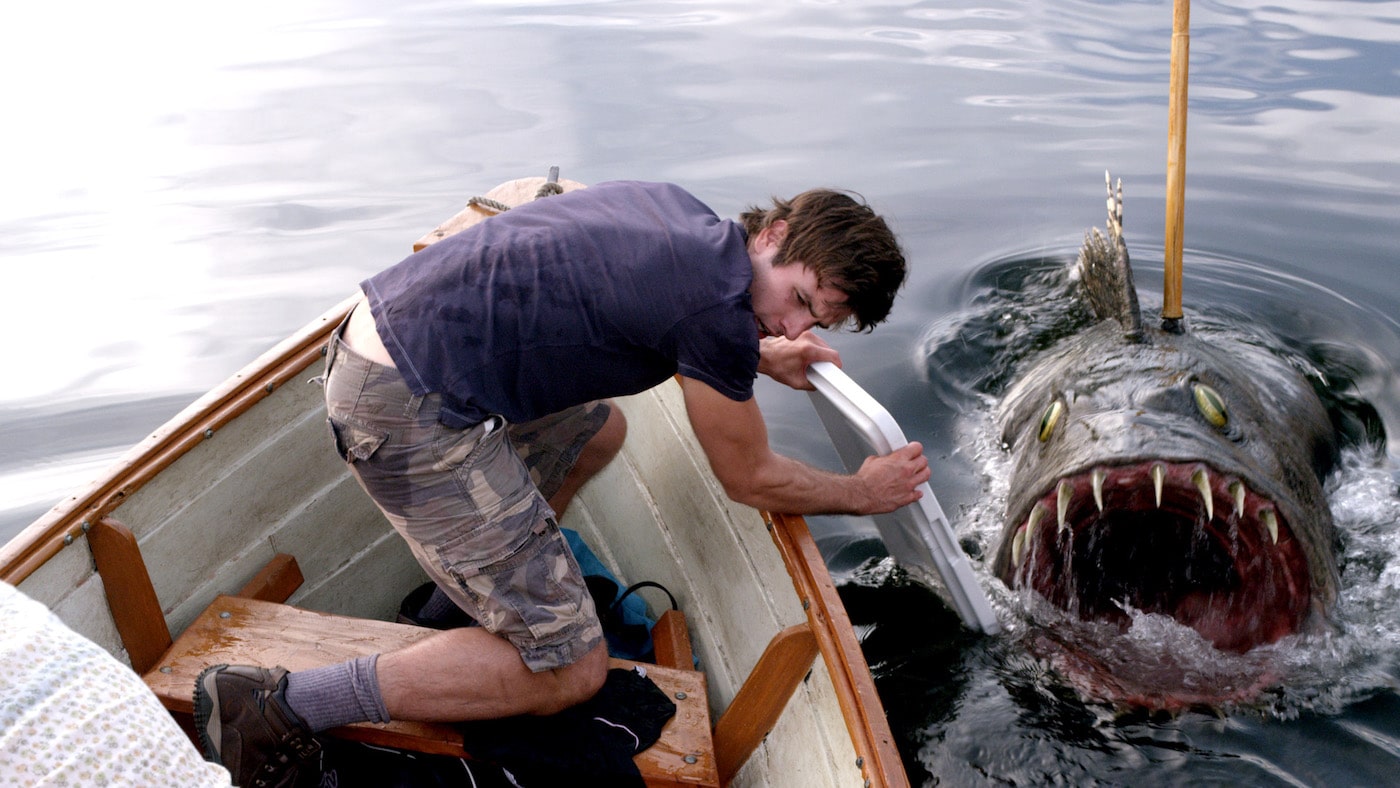 An opening dream sequence establishes that apparent protagonist Johnny (Daniel Zovatto) might have some idea of what awaits him and a quintet of his recently graduated high-school friends when they travel to an isolated lake for one last get-together before going their separate ways. The group consists of four guys and two girls—never a good ratio in a scenario where relationship issues are bound to raise their ugly heads—and they all pile into an old rowboat to head across the water. When they stop halfway over so a few of them can take a dip, while Johnny tries (though not too hard) to dissuade them, a six-foot flesheating fish raises its own ugly head and tries to eat them, then goes on to thwart their attempts to paddle to safety.