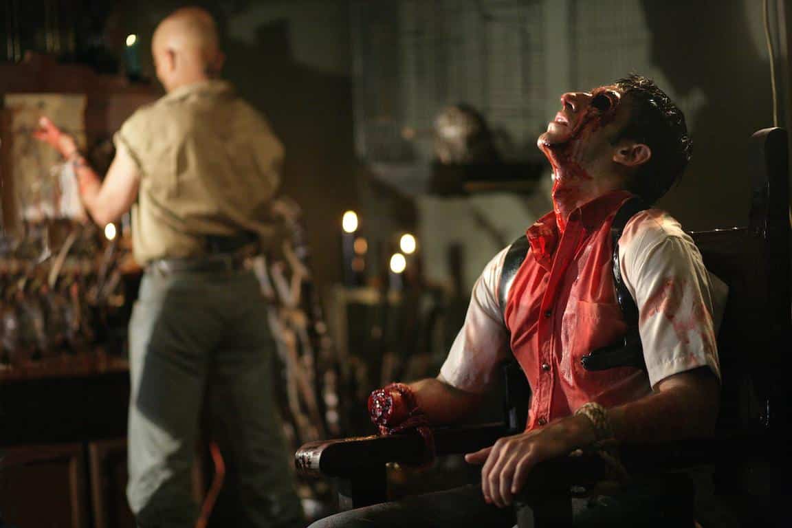 A trio of friends head to a foreign country in search of women, booze and assorted good times, only to run afoul of a shadowy organization that wants to torture and kill them. Here we go again, right? Not quite; Borderland (which recently premiered at the South by Southwest Film Festival ahead of release later this year by Lionsgate) is played as more of a suspense drama than a horror film overall, despite starting with one of the hardest-to-watch scenes of violence in recent memory. As they explore a creepy, rundown house, a pair of Mexican cops are set upon by a group of vicious thugs, including a big bald guy (Marco Bacuzzi) who vaguely suggests a south-of-the-border Michael Berryman. One of the policias is strapped to a chair and has several portions of his anatomy forcibly removed, as his partner looks on in terror—and is told to take this as a warning not to mess with the villains’ activities.
