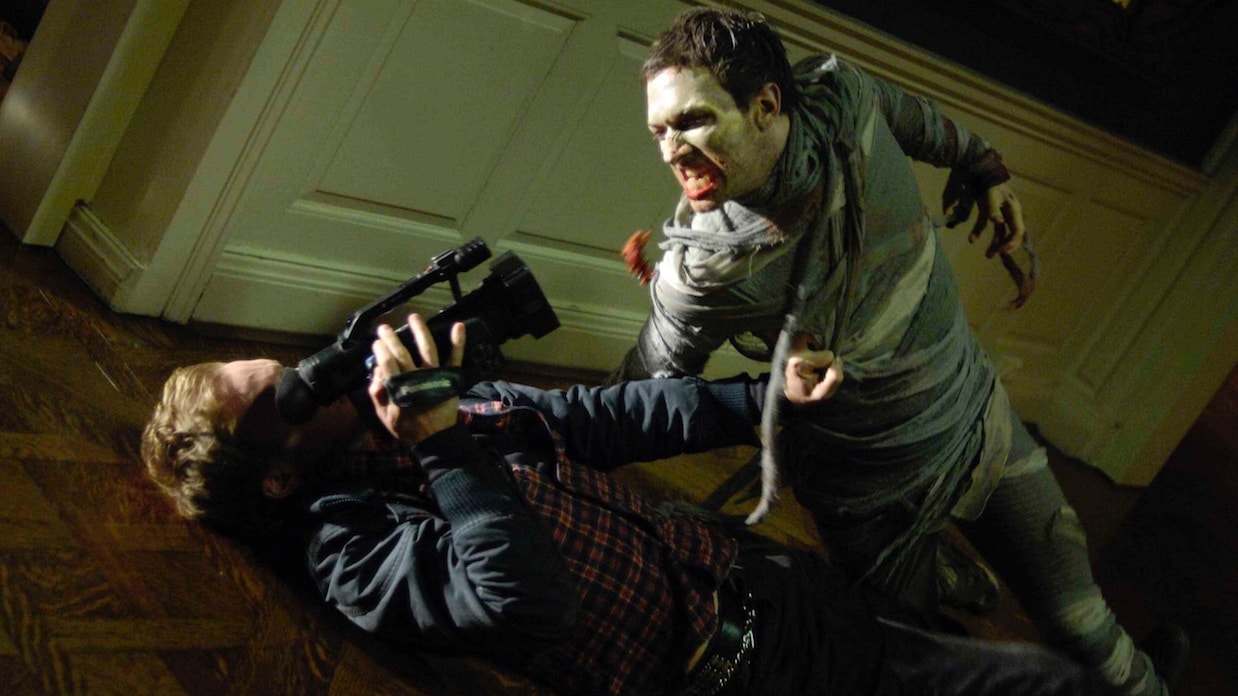 Many DVDs have alternate audio tracks one can choose to listen to, but Diary of the Dead is the first one on which I was hoping I could mute one particular sound channel instead. Specifically, it would have been a welcome option to silence the narration by Debra (Michelle Morgan), the film’s heroine, who has ostensibly edited together the video footage that makes up George A. Romero’s latest entry in his ongoing undead saga. This one reboots the previous movies’ themes for the digital age, centering on a group of film students who become caught up in a new dawn of the dead, capturing the burgeoning ghoul outbreak on their cameras—largely the one wielded by Debra’s boyfriend Jason (Joshua Close)—with bits and pieces stitched in from other on-line sources. This new vérité approach to his now-classic tropes gives Romero the opportunity to comment on a modern world overwhelmed by taped/Internet information.