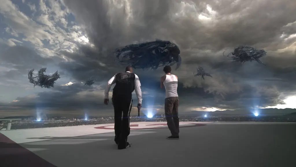 But then, there’s very little reason given to care about these barely sketched people at any point. Jarrod (Eric Balfour), who is apparently some kind of artist, is in LA with his pregnant girlfriend Elaine (Scottie Thompson), visiting his pal Terry (Donald Faison), who is apparently some kind of producer. More importantly, since he’s the one African-American character, he packs heat and says things like, when fighter jets streak over his high-rise, “They called in Homeland Security, ’cause this party’s gonna be da bomb!” Late at night after that bash, strange lights drop out of the sky and hypnotize the populace, who are then sucked en masse up into massive spacecraft that appear over the city (Skyline’s one truly arresting image, albeit one already widely familiar from the ads). Jarrod, Elaine, Terry, the latter’s girlfriend Candice (Brittany Daniel) and his on-the-side babe Denise (Crystal Reed) manage to survive unsucked—perhaps because, as we learn, the aliens are after human brains, and they’d be hard-pressed to find one among this bunch.