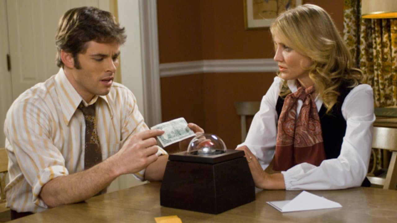 Based on Richard Matheson’s 1970 short story “Button, Button,” The Box relocates the action to Virginia in 1976, where Arthur Lewis (James Marsden) is a NASA technician and his wife Norma (Cameron Diaz, with a fetching drawl) teaches at the private school attended by their preteen son Walter (Sam Oz Stone). They’re a loving couple, and Arthur is even taking advantage of his skills and facility to create a prosthesis for Norma’s disfigured foot that will allow her to walk without a limp. Then a double dose of bad news hits: Arthur is turned down for entree into an astronaut program that would bring a significant salary hike, and Norma is told she’ll no longer be receiving a staff discount for Walter’s tuition. Into these dire financial straits walks Arlington Steward (Frank Langella), a mysterious man missing part of his face who arrives with the titular unit and an offer for the Lewises: If they push a button on the box, they’ll receive a million dollars in cash—and someone they don’t know will die.