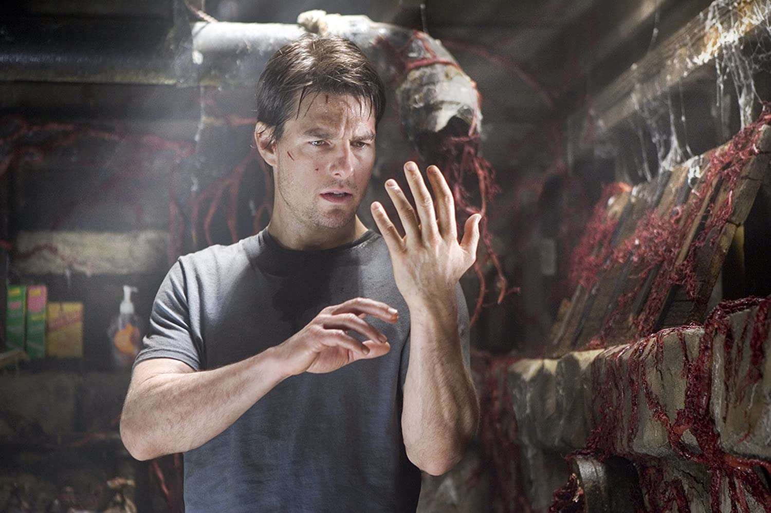 Usually, spectacle has a way of overpowering and even negating deep-seated terror, but Spielberg makes War’s big action setpieces personally harrowing by drawing on contemporary real-life fears and keeping his focus on an individual’s reaction to the terrifying threat. Specifically, the protagonist is Ray Ferrier (Tom Cruise), a New Jersey dockworker who’s not really one for responsibility, particularly that which comes with his children, teenaged Robbie (Justin Chatwin) and preteen Rachel (Dakota Fanning). It’s not long after his ex-wife Mary Ann (Miranda Otto) has dropped them off at his house and headed for a trip to Boston than strange stormlike phenomena begin to darken and disrupt the sky, and electronic equipment and automobiles soon go dead. Heading out to investigate, Ray and his neighbors witness an enormous, three-legged war machine erupt from the ground, mercilessly blasting humans and buildings—and that’s where Spielberg grabs you by the throat and rarely lets go for the next 100 minutes.