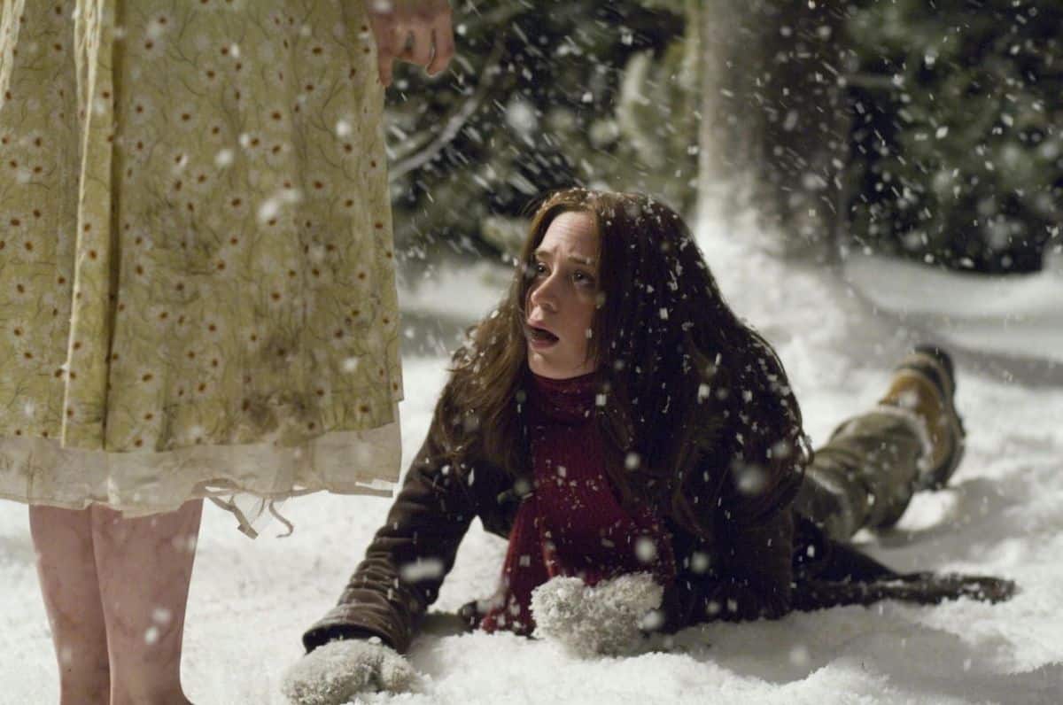 The same goes for Wind Chill, which no doubt coincidentally follows the same narrative pattern as last week’s Sony release Vacancy: bickering couple on a cross-country drive take the wrong back route, their car breaks down in the middle of nowhere, bad stuff happens. In this case, the unnamed Girl (Emily Blunt), who needs a Christmas-vacation lift from college to her home in Delaware, answers a ride-share ad posted by the similarly unnamed Guy (Ashton Holmes). She’s moody and he seems a tad strange, and may have even manipulated the whole scenario to get some time alone in his vehicle with her; why else would he take a “shortcut” off the main highway onto a lonely, snowy road? Before she can get to the bottom of his behavior, they’re forced into an accident by another driver who then speeds off, leaving them stranded to deal with each other, the encroaching cold…and strange figures that begin appearing out of the wintry darkness.