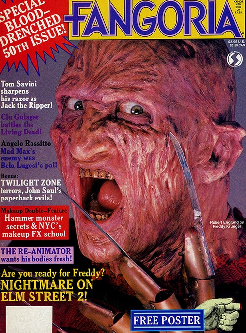 The film was a smash success, so much so that New Line Cinema became known as “the house that Freddy built.” This also led to a long tradition of Englund appearing on the cover of FANGORIA (Our EIC Phil Nobile Jr. recently referred to the magazine as “The magazine that Freddy built”). The actor holds the distinction of being featured on the magazine cover more than anyone else, dating back to the earliest days of this franchise's run. He even helped the mag celebrate a major milestone, gracing the cover of FANGORIA #50 to promote A Nightmare on Elm Street 2: Freddy's Revenge.