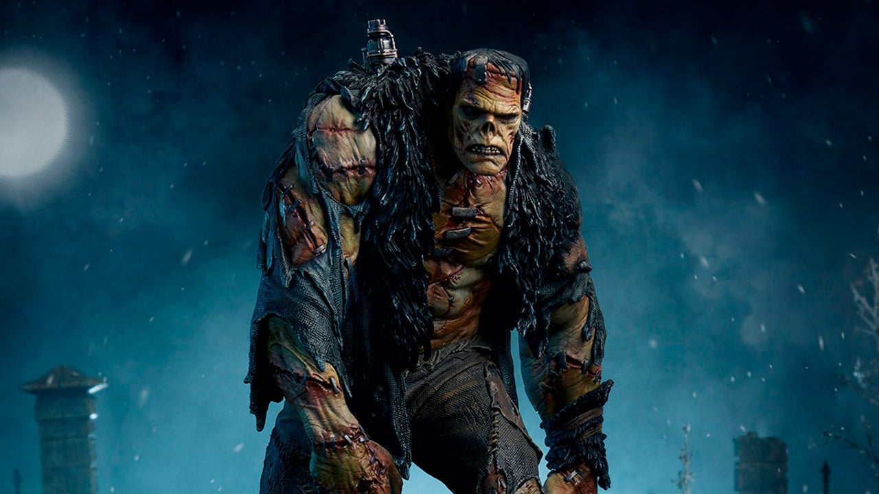 This stunningly detailed, fully sculpted and hand-painted masterpiece shows the hulking figure cloaked in the pelt of a black bear and clad in ragged patchwork attire. Two gargantuan electrodes emerge from his back, and metallic staples hold his discolored flesh together.