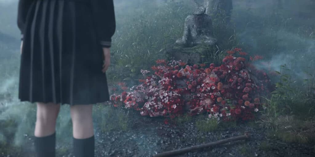 Silent Hill might be famous for its gruesome, twisted monsters, and the Silent Hill f teaser promises no shortage of that. Ebisugaoka seems to have been taken over by some kind of sentient red vine that leaves trypophobic holes in the flesh of all those it touches. Take this with a grain of salt, but, the web-translated CG World interview with Shirogumi mentions that the plants' “erosion effect [is] caused by mysterious creatures”.