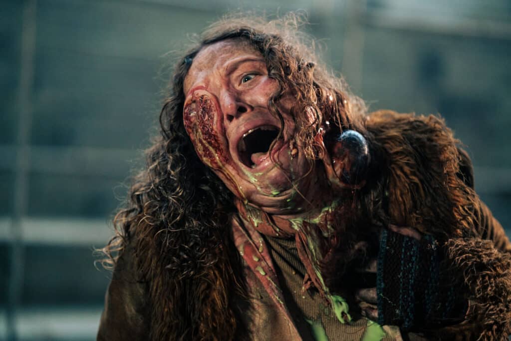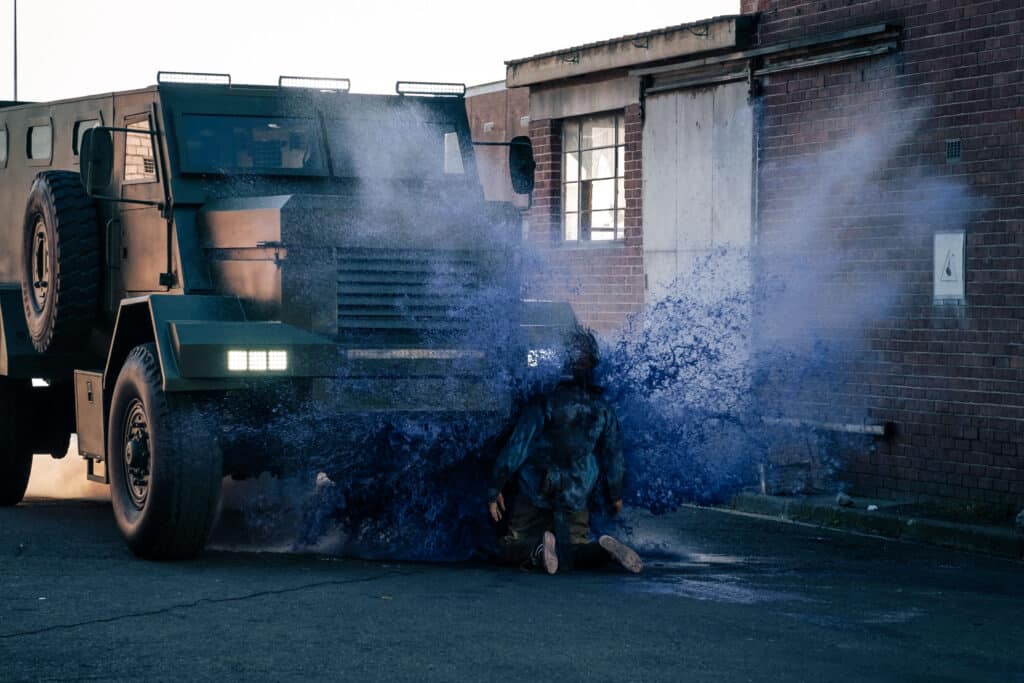 The director’s ability to drill down to the essence of a dystopian world while rich leaders declare genocide on the homeless elevates the film into unexpected feel-good territory. In particular, the magnetic chemistry between Ronald (Sean Cameron Michael) and Alex (Donna Cormack-Thomson) shines exceptionally bright. Cameron portrays an impoverished veteran with PTSD and a soft spot for the underdogs of society. His character, Ronald, rescues Alex from a brutal beatdown after promising the goons a steep payment plan in return. Although the last thing Ronald’s small group of justice-seeking hobos want is some outsider joining their ranks, Alex quickly fits in and proves down for their cause of overturning the governmental scum before their unhoused peers are eradicated for good. While there’s plenty of shoot ‘em up action and all the melted faces and flying entrails you could want, the quieter moments of shared dialogue between Ronald and Alex that truly convey a deeper meaning of what’s at stake.
