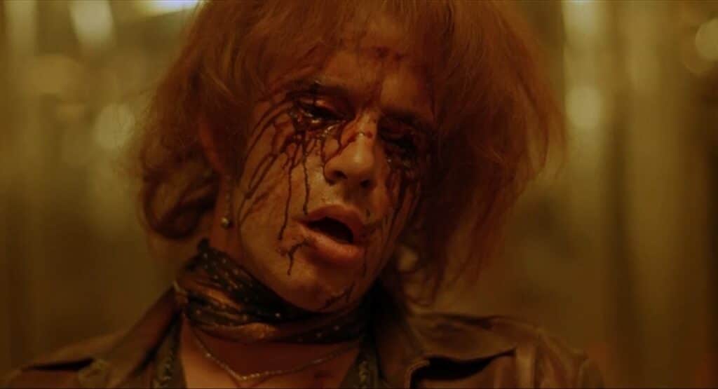 As it should have played out, after killing the poor coworker, Curve and Kali trash the office until they find some business papers with Sarah’s address. But at this point, the tattoo of a crow on Curve’s chest (a recurring plot point that is barely glimpsed in the theatrical cut) starts to bleed, which is why he suddenly freaks out and leaves. Why they would leave in his reaction without the setup is a mystery only the Weinsteins can answer, but they have other things to worry about now.