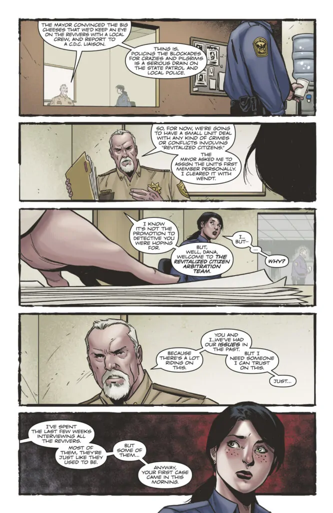 “The biggest influence on Revival at the time was reacting against things I love, like the Romero films. In those stories, people were on their own, and the system had fallen apart. Our thing was, ‘What if the system has held, but it’s the people who are starting to fall apart?’” Seeley explained. “The zombie story tends to be about survivalism before anything. So, we wanted to see if we could do a zombie story about something other than survivalism. For us, it became a metaphor for the way we deal with grief and move on from losing someone.”