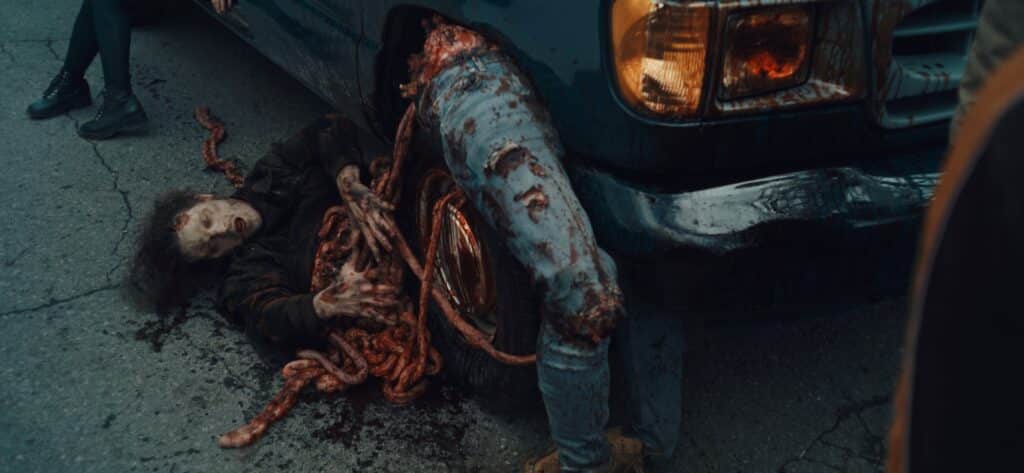 If this sneak peek clip and stills are any indication of what's in store, we're in for a gory good time. Intestines all out like some sort of sick zombie spaghetti. Disgusting. I'm into it.